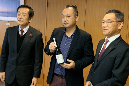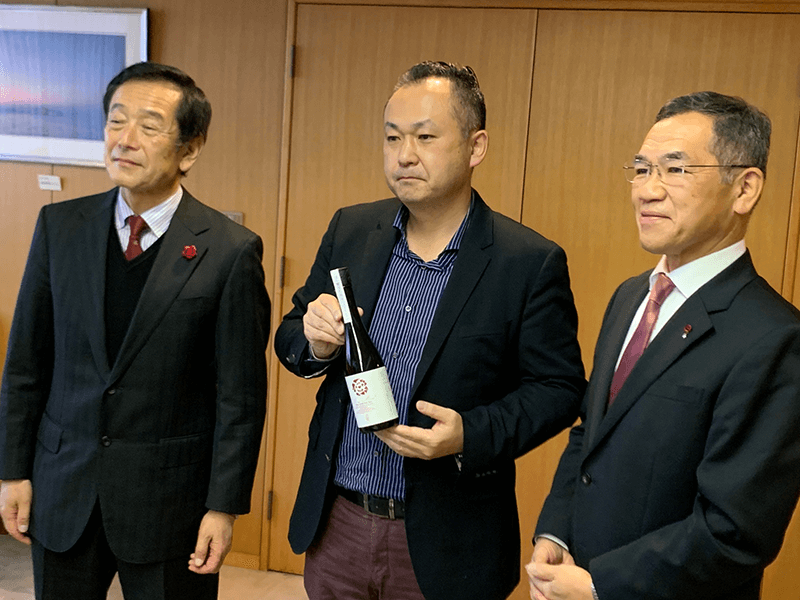 2月8日(月)、天寶一の村上社長と福山大学の久冨教授は、バラ酵母日本酒(ローズマインド)の完成報告のために枝広福山市長を表敬訪問しました。枝広市長は、その場でローズマインドを試飲されて、その飲み口の良さを絶賛されました。