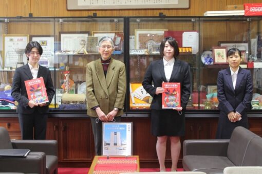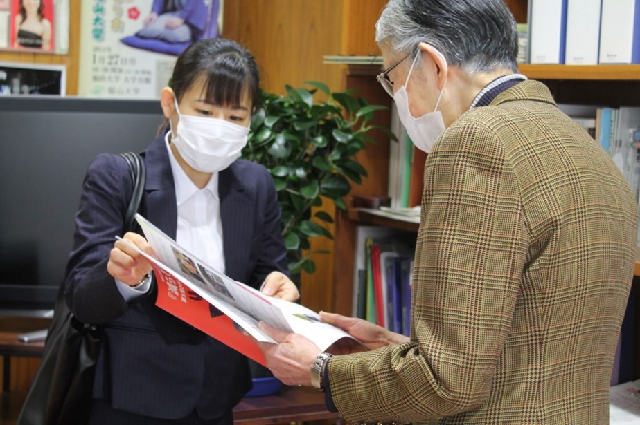 犯罪心理学研究室の加賀山海咲さんが、ボランティア団体のPACE福山支部代表の稲葉美月さん(捜査心理学研究室)や同副代表の安達優佳さん(犯罪心理学研究室)とともに、リーフレットを持って松田学長へ報告に行きました。その様子を加賀山さんにリポートしてもらいました。