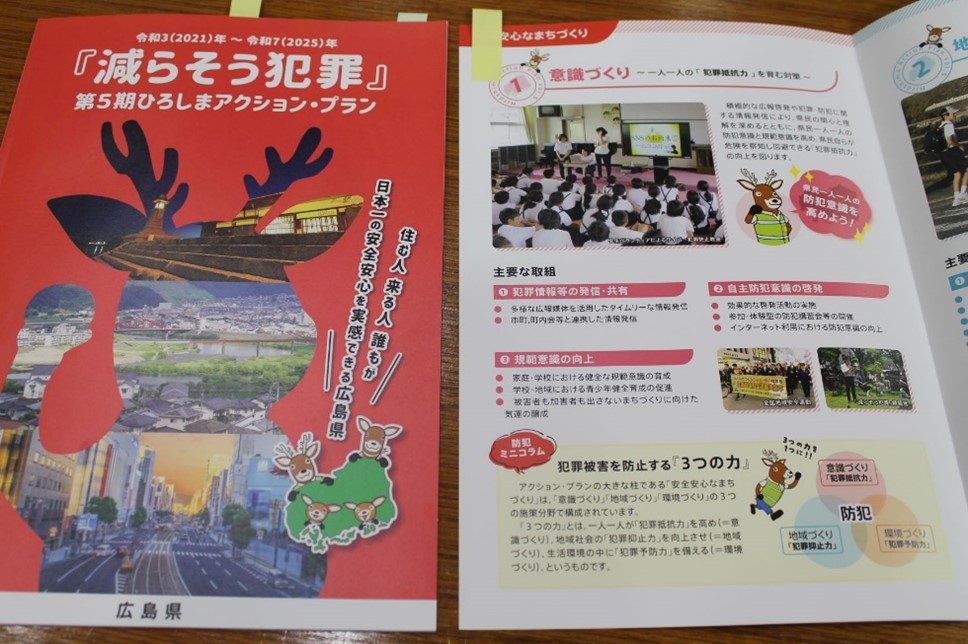 2021年から2025年までの5年間、「減らそう犯罪」広島県民総ぐるみ運動(第5期)が実施されます。その5年間のアクション・プランのリーフレットに、犯罪心理学研究室と捜査心理学研究室(大杉朱美講師)の学生の、活動の様子を写した写真が採用されました。
