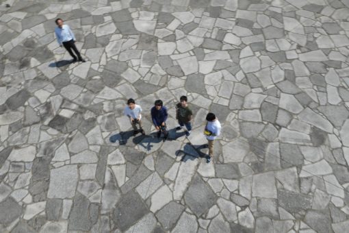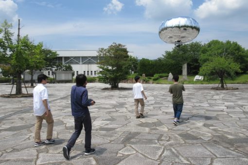 プロジェクトチームの一行は、1号館前の記念広場へ。