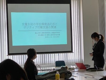 三浦なつみさんも公認心理師資格の取得を目指しており、450時間の実習と並行して、修士論文の完成に励みました。研究テーマは「児童生徒の学校環境適応感とポジティブ行動支援の関連」です。小学校5校で実施されたポジティブ行動支援の効果検証を行いました。その結果、ポジティブ行動支援を実施した担任教師や児童の評価からポジティブ行動支援によって児童の学校適応感が高まったことが明らかになりました。ポジティブ行動支援にも様々な種類があるようで、これらの支援内容は、今後教育領域や福祉領域の臨床にも役立てることができそうでした。