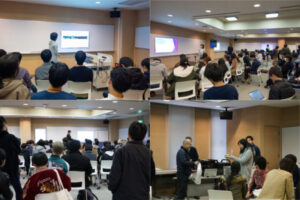 メディア・映像学科では、例年2月に大学会館のCLAFT教室で研究発表会を行っていますが、この発表会は学生が勢ぞろいする賑やかなイベントです。写真は昨年度の様子です。