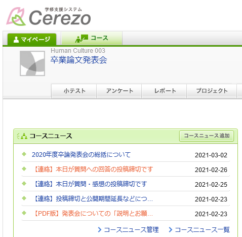 「オンライン」とはいえ、形式はさまざまです。人間文化学科ではZoom等を利用したリアルタイム方式ではなく、学内ポータルの「セレッソ」を利用したオンデマンド式の発表を行うこととしました。インターネット環境や操作の面から、Zoomでの利用に不安を感じる学生もいたためです。