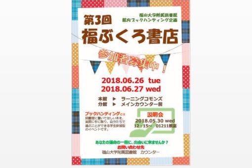 最後にもう一回。第3回「福ぶくろ書店」は6月26日(火)~6月27日(水)、本館は9:00~16:30に図書館本館(15号館)内ラーニングコモンズ、分館は12:00~16:30にメインカウンター前で開催します。多くの学生の皆さんのご来店、お待ちしています。