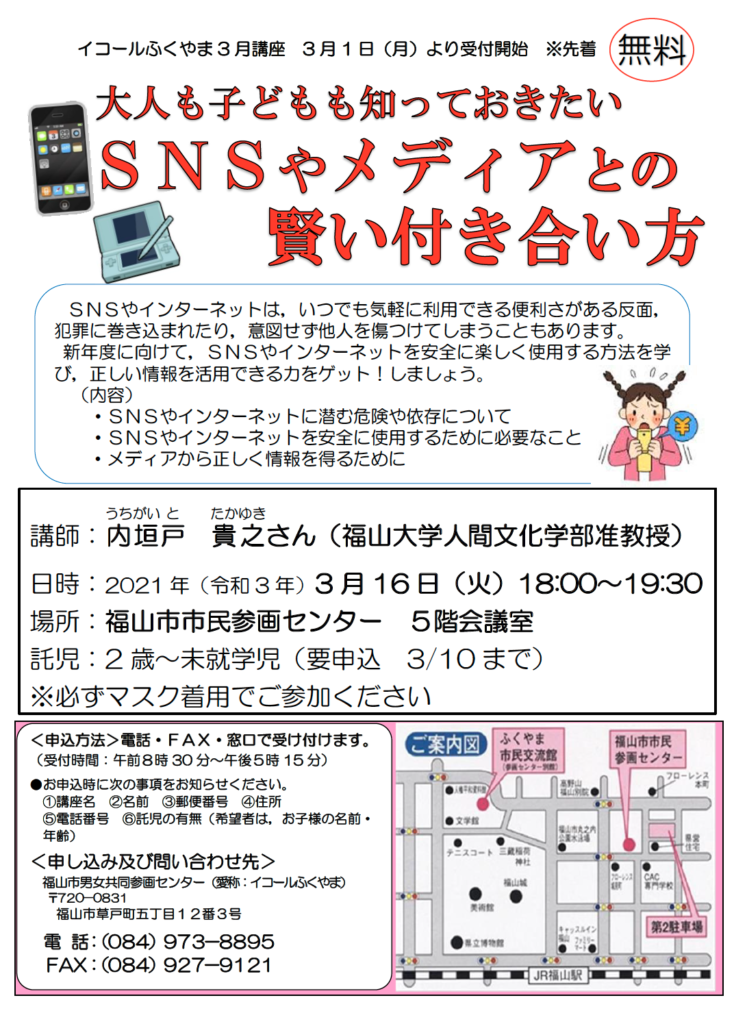 内垣戸准教授は大学内だけではなく、近隣の学校などでもネットリテラシーなどに関する講演を行っています。今回は、福山市男女共同参画センター(愛称:イコールふくやま)による講座「大人も子供も知っておきたい SNSやメディアとの賢い付き合い方」に講師として登壇します。