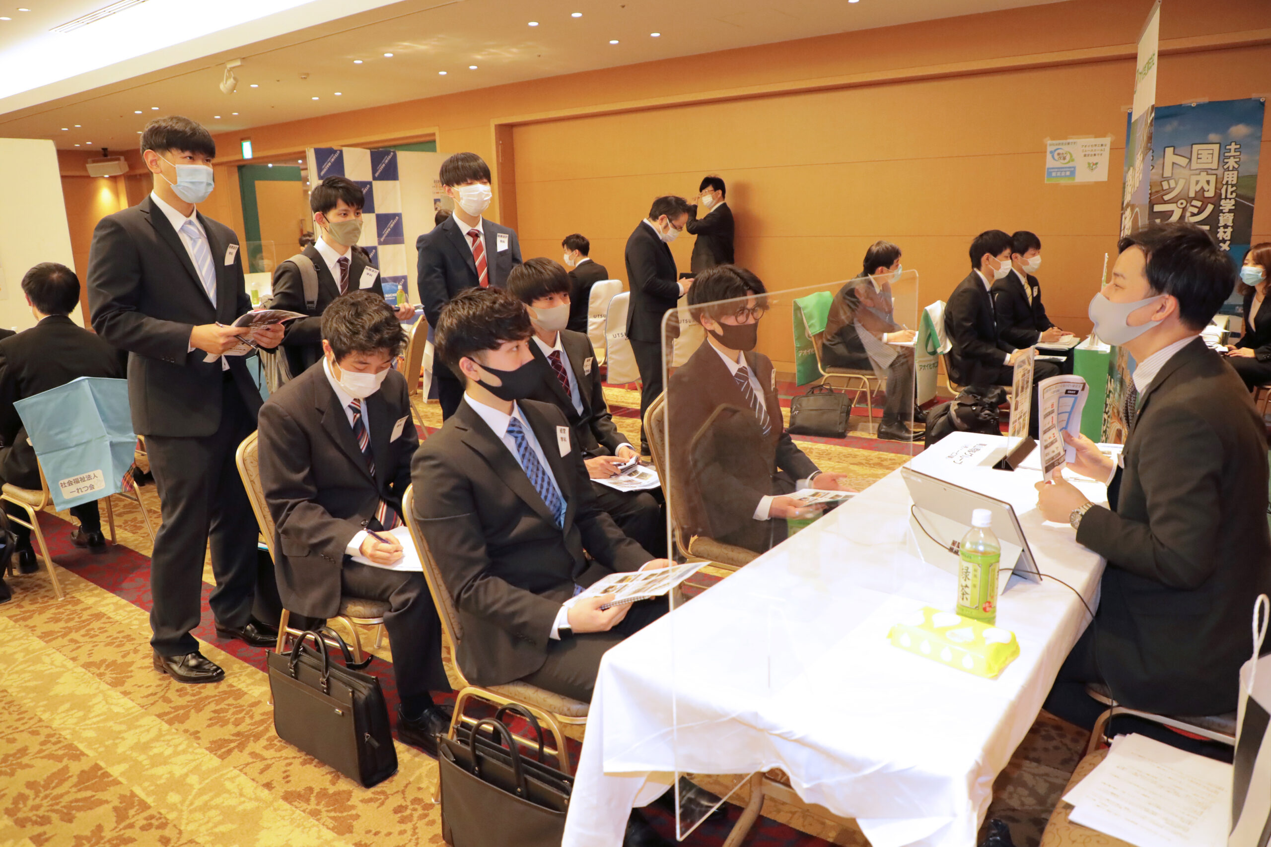 また、コロナ禍での終息前の開催のため、感染拡大防止策を徹底したうえで対面のブース形式で行いました。具体的には、手指の消毒や検温を行うとともに、学生には2週間の自己健康管理票の記入確認を行い、出展企業には参加者を中国・四国地方在住者に限定していただく等の対策を行いました。