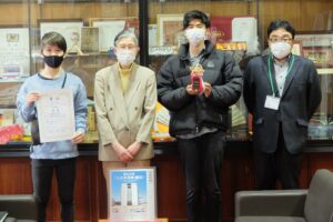 学長室訪問を終えて、2人は「EV創作の授業でレースに参加することで、いろいろな経験をすることができました。今回、EV部門で優勝することができましたが、いろいろ反省点もありました。もし、また参加することができましたら問題点を解消し、もっといい成績を狙いたいです。」と話していました。