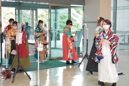 当日の朝、会場である大学会館に卒業生が集まってきました。密にならないようにスタッフが随時声掛けをし、また入場時には体温チェックと手指の消毒を行いました。
