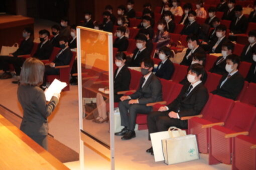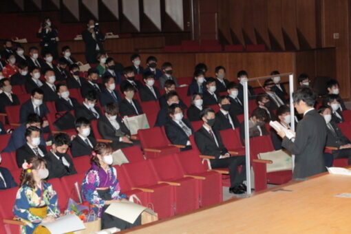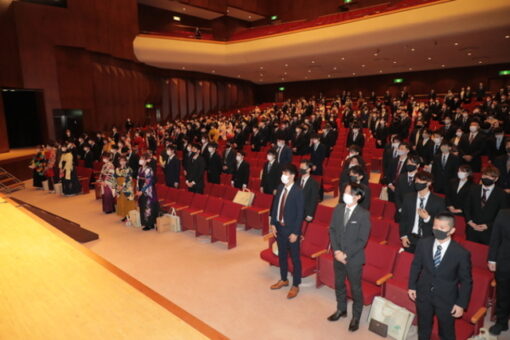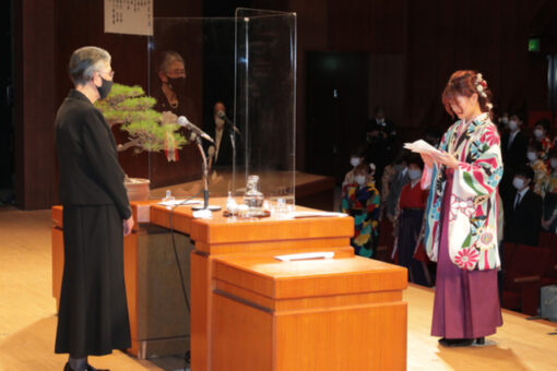 新型コロナウイルス感染症予防のため、第一部(経済学部薬学部)と第二部(人間文化学部工学部生命工学部)の二部制とし、保証人や来賓の入場もご遠慮いただいて密を避ける形で式を執り行いました。