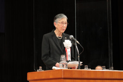 松田学長の式辞です。式辞に先立ち、新型コロナウイルス感染症防止の観点から式が例年とは異なる形で実施されたことについて、説明がなされました。