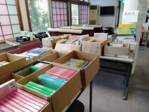 下の写真は「爽風館」恒例の風景です。上級生が不要になった参考書などを下級生へ譲ります。