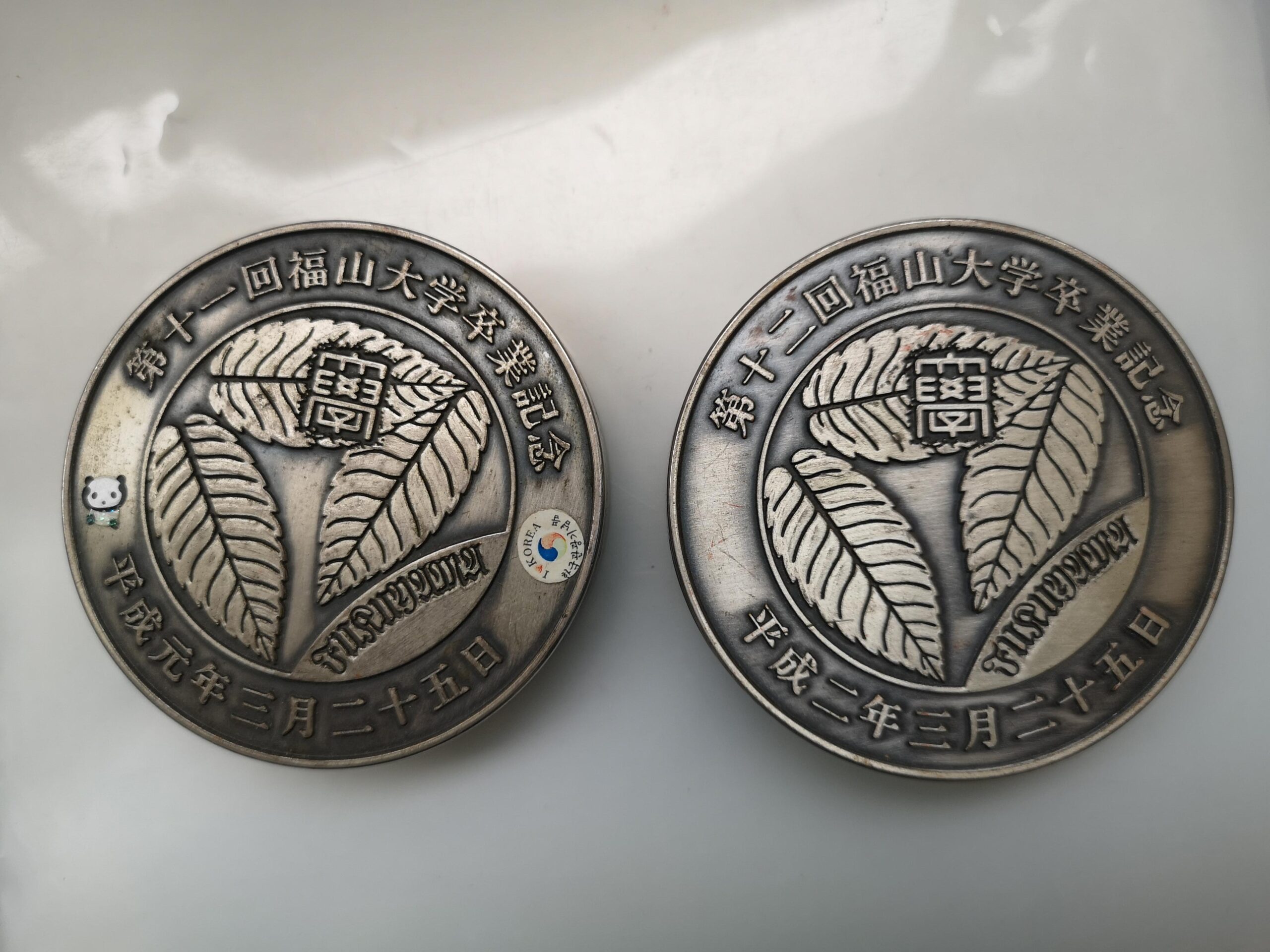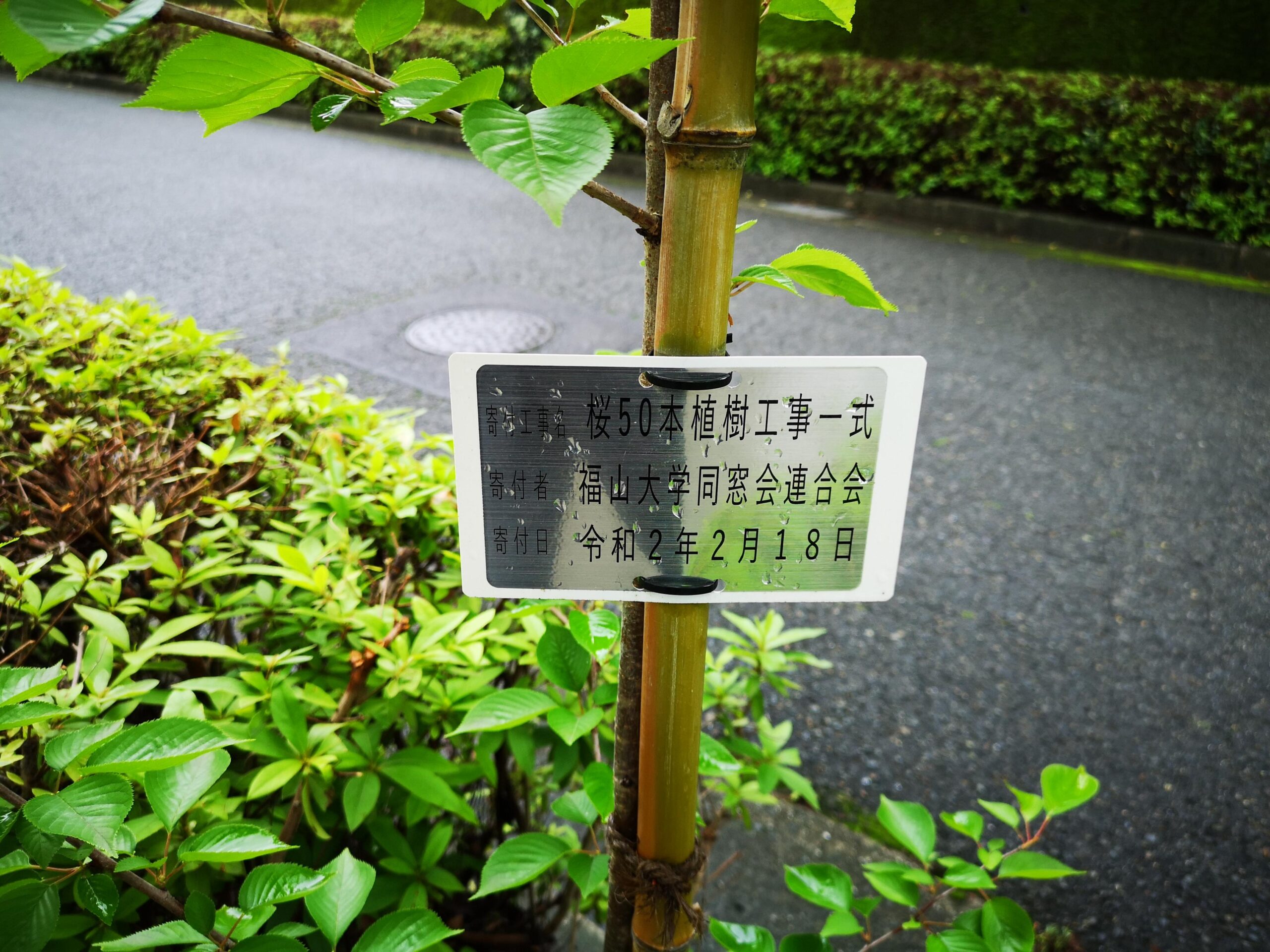 さらに、キャンパスを歩いていると「桜50本植樹工事一式」と記されているものに目がとまり、続けて「福山大学同窓会連合会」とあります。また、毎日のように足を運ぶ事務室には福山大学の徽章とともに「福山大学卒業記念」と刻まれている肉池が目に入ります。