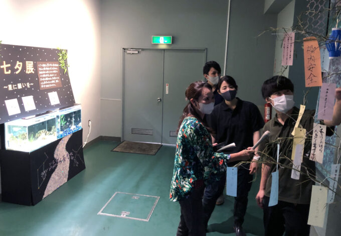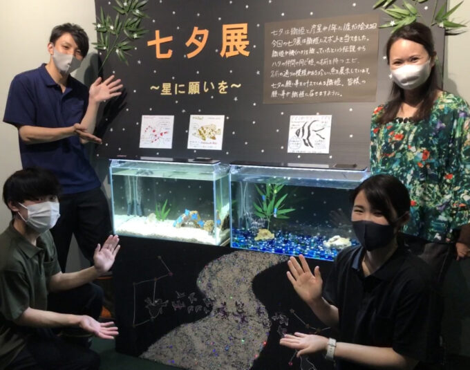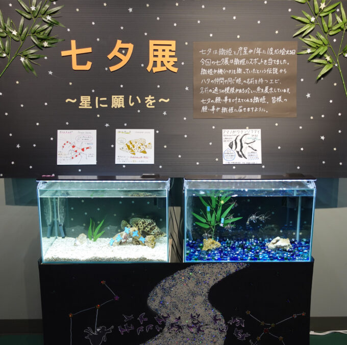 海洋生物科学科アクアリウム科学研究室では、今年度は16名の学生がマリンバイオセンター水族館の運営を行っています。その水族館運営メンバーの学生が、7月7日(水)の七夕をテーマに企画展示水槽を立ち上げました。その名も「七夕展 〜星に願いを〜」です。