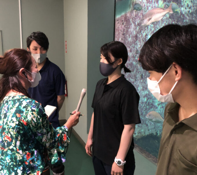 インタビューは1時間ほどでした。海洋生物科学科4年生の月野くん、藤野さん、靏田くんが取材対応をしました。ラジオ放送を通じて、学生たちの展示水槽に込めた熱い想いを、是非お聴きください♬