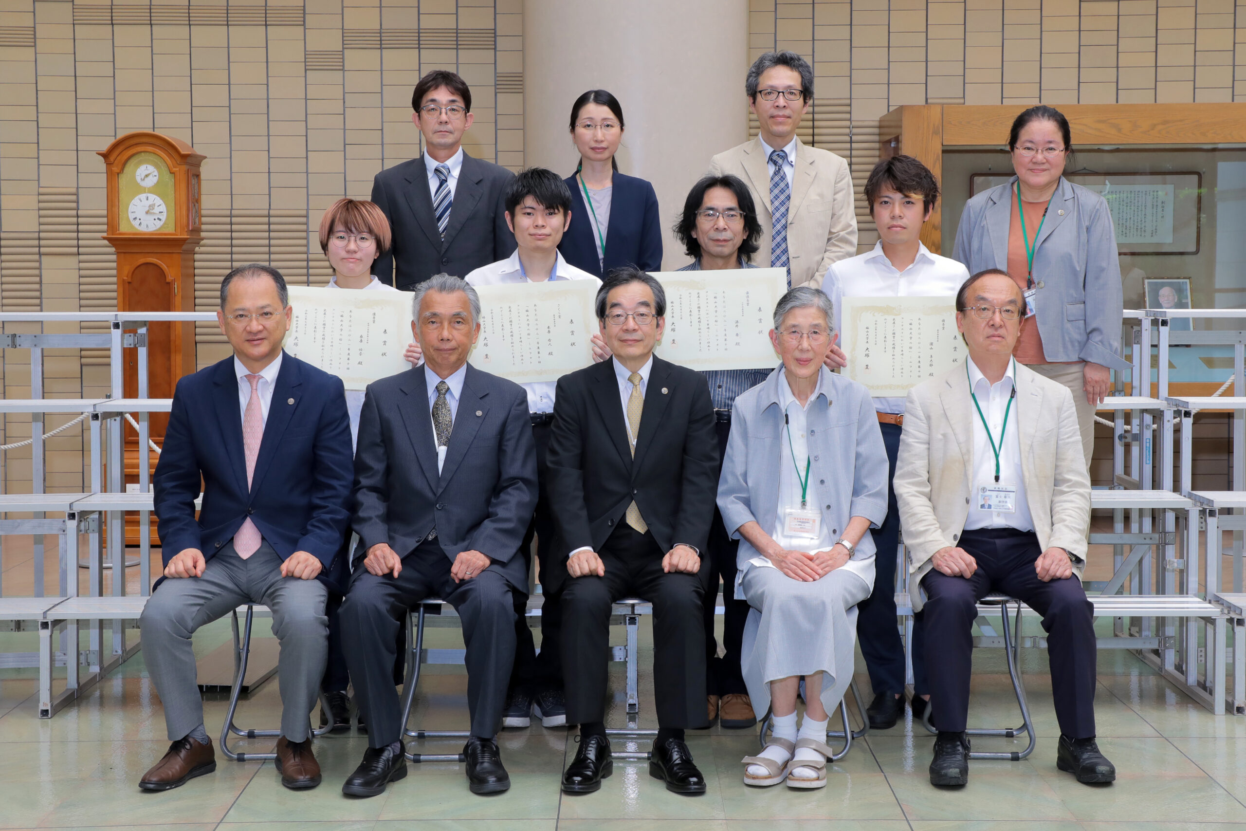 これが関係教員と一緒に記念写真に収まった学長賞受賞の皆さんです。受賞者の皆さん、みんないい顔をしていますね。