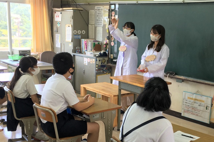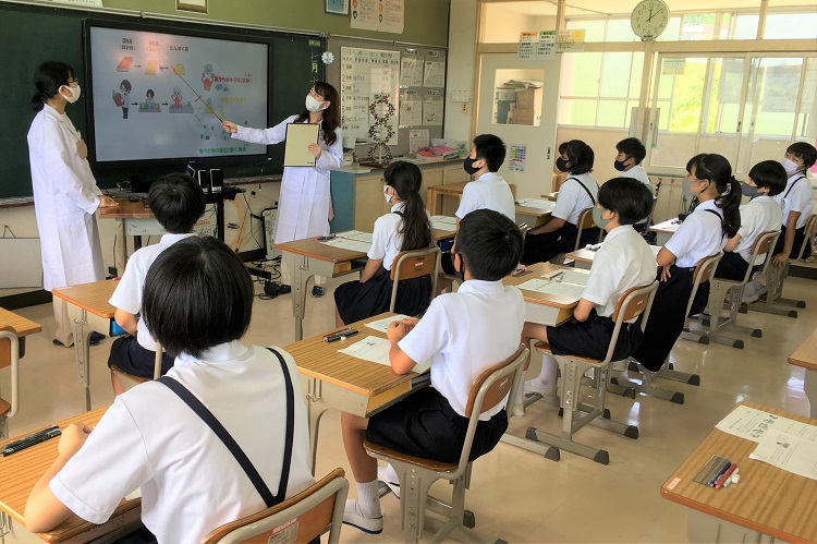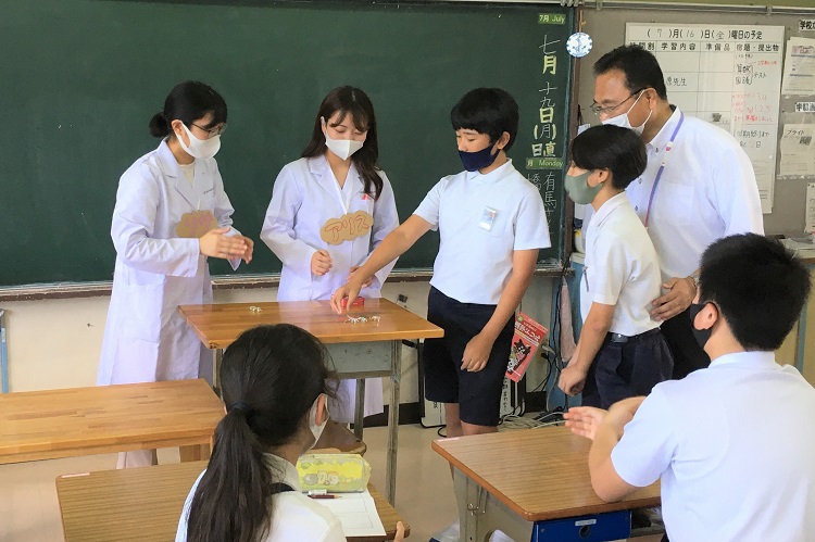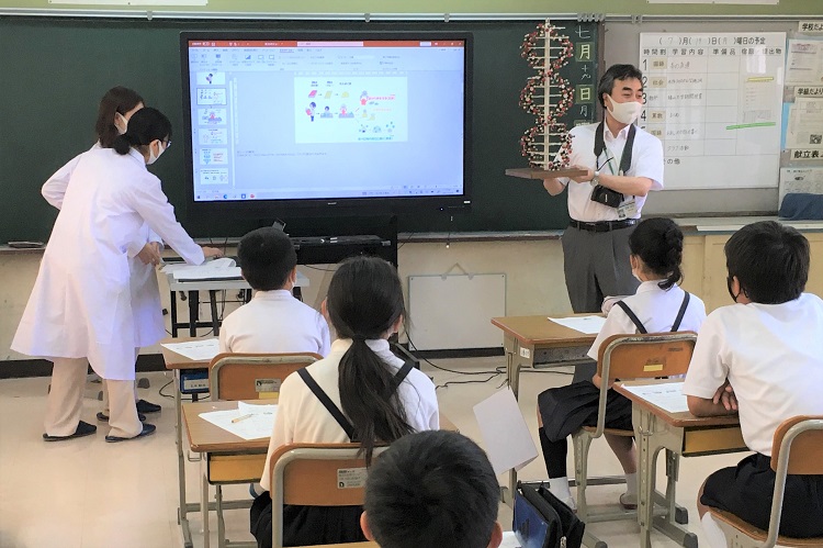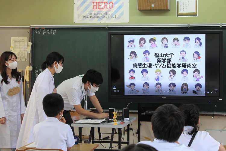 7月19日(月)、薬学部の「病態生理・ゲノム機能学研究室」の学生2名(5年生の吉岡利紗さん、山岡愛主さん)と教員2名(道原明宏 教授、松岡浩史 准教授) が「尾道市立西藤小学校」に赴き、3・4時間目を使って5年生21名と6年生28名を対象に、遺伝子を利用した未病対策に関する教育啓発活動を行いました。道原教授と松岡准教授からの記事について、学長室ブログメンバーの薬学部・猿橋が報告します。