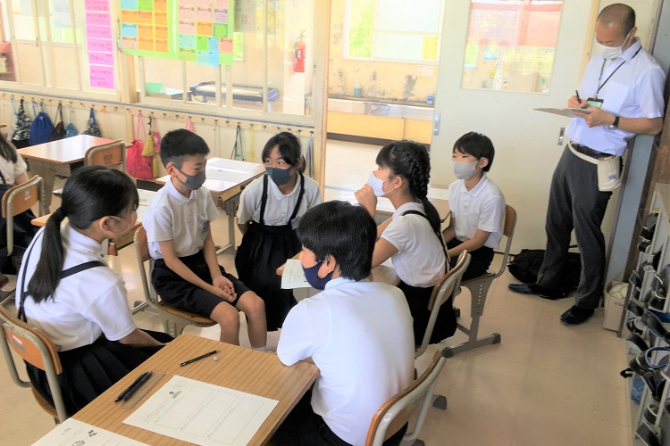 授業後は校長室に移り、本藤校長と意見を交わしました。『西藤小学校と福山大学はとても近いのに、小学校にとって大学は遠い存在です。イキイキとした大学生の存在は、小学生たちが自分たちの近い未来を思い描くキャリア教育にも通じる取り組みで、今後も福山大学との関わりを大事にしていきたいです。』と仰っていました。