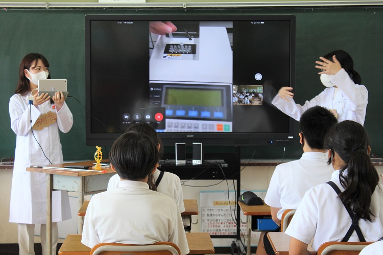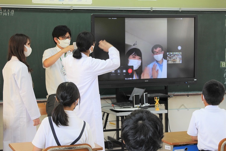 まず最初に、アイスブレイクとして、西藤小学校と未来創造館をFaceTime通話でつなぎ、福山大学のロゴ入り白衣を着た学生同士がライブ中継を実施しました。さらに、福山大学オリジナルのロゴ入りマスクもつけています。
