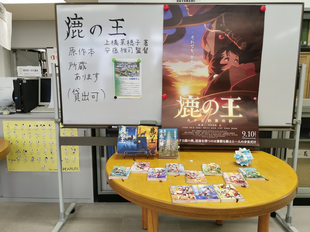 図書館では、安藤氏よりいただいた今作のポスター、原作本である『鹿の王』シリーズと上橋氏の別の作品を展示しております。全て館外貸出可能な資料ですので、映画の公開までにチェックしておくのもアリだと思います!