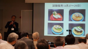 このお披露目会の評価をもとに商品開発した4種類のお寿司の試験販売を2018年の4月27日から29日の3日間ほど、廻鮮寿司しまなみ様で行いました。