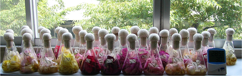 フラスコにバラと培地を投入し、微生物を増やしているところです。各バラが色とりどりで非常に綺麗です。