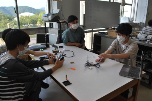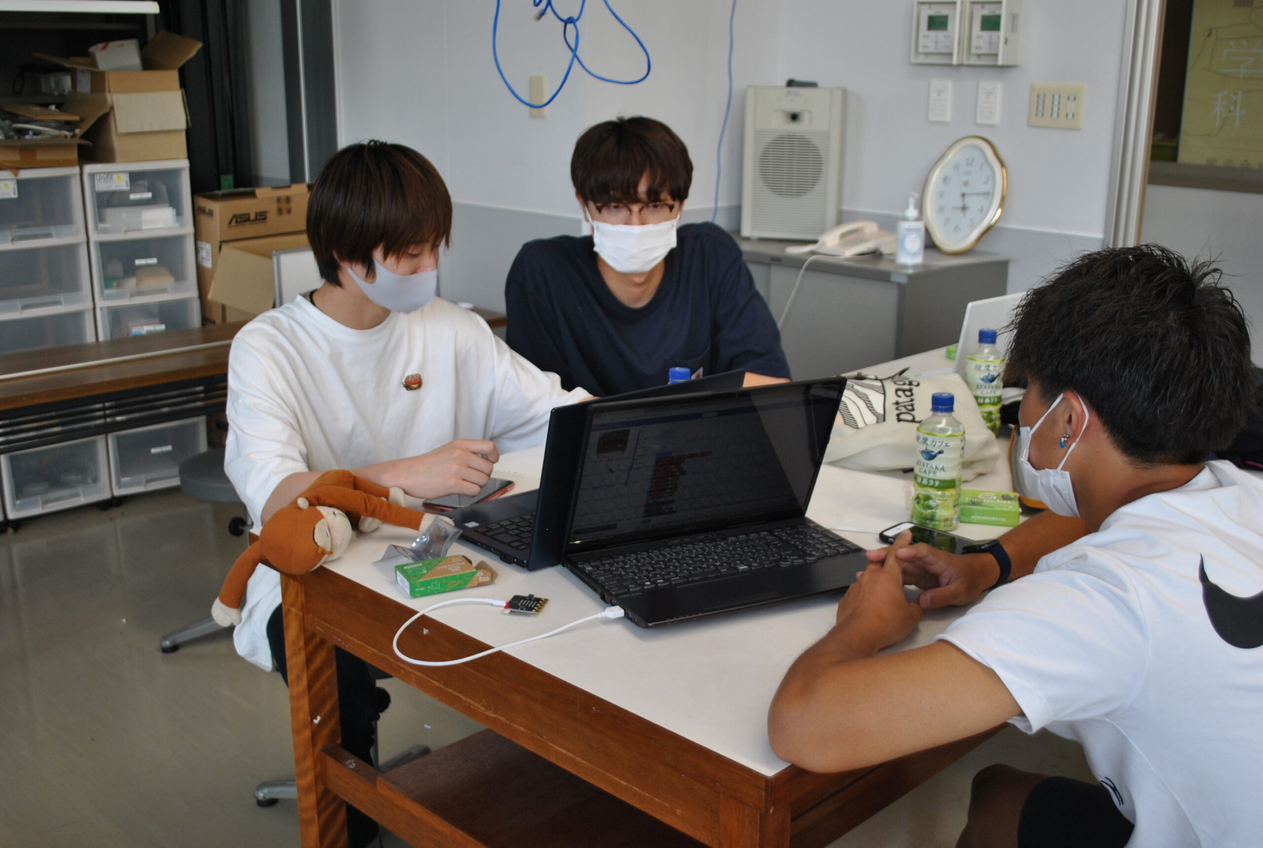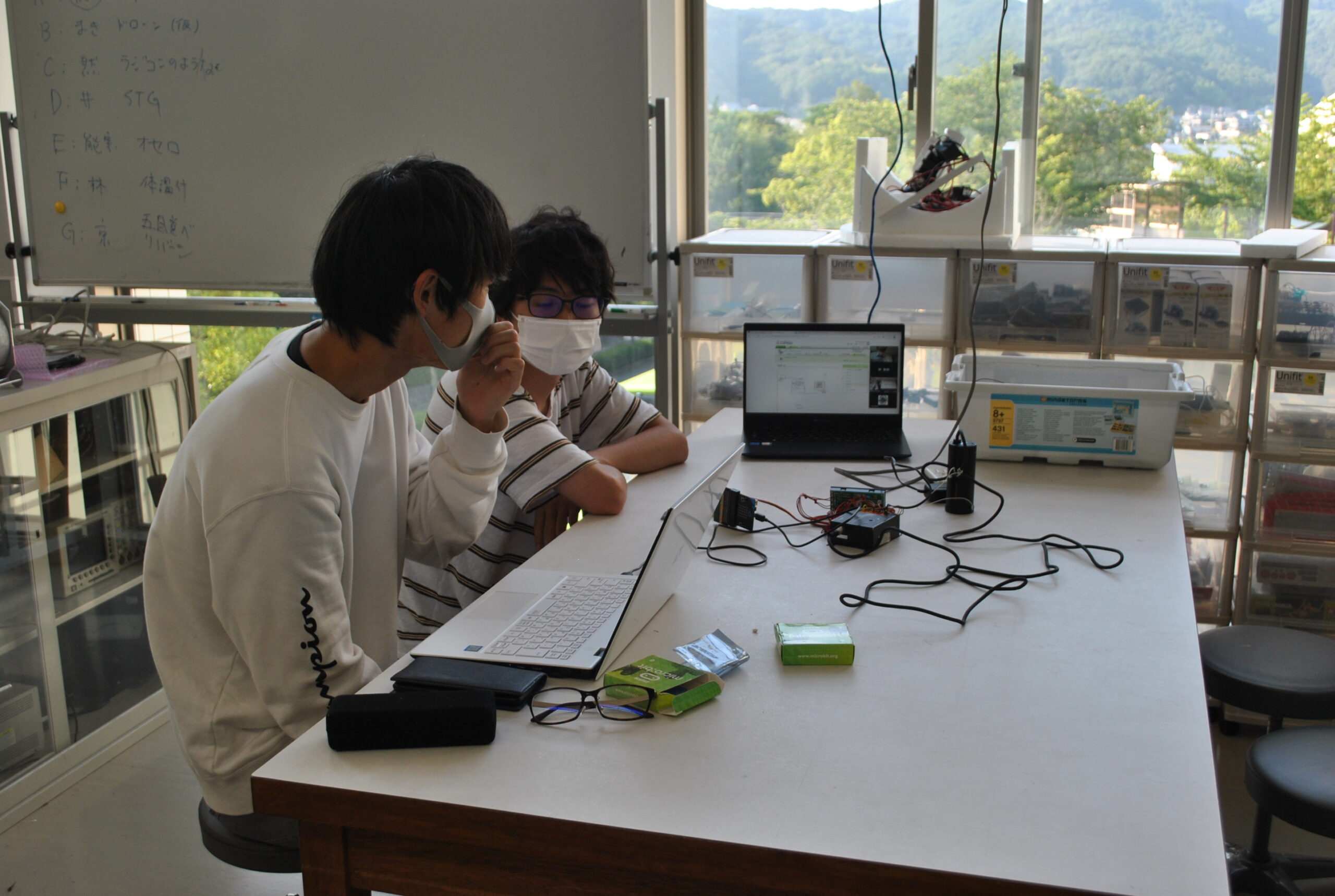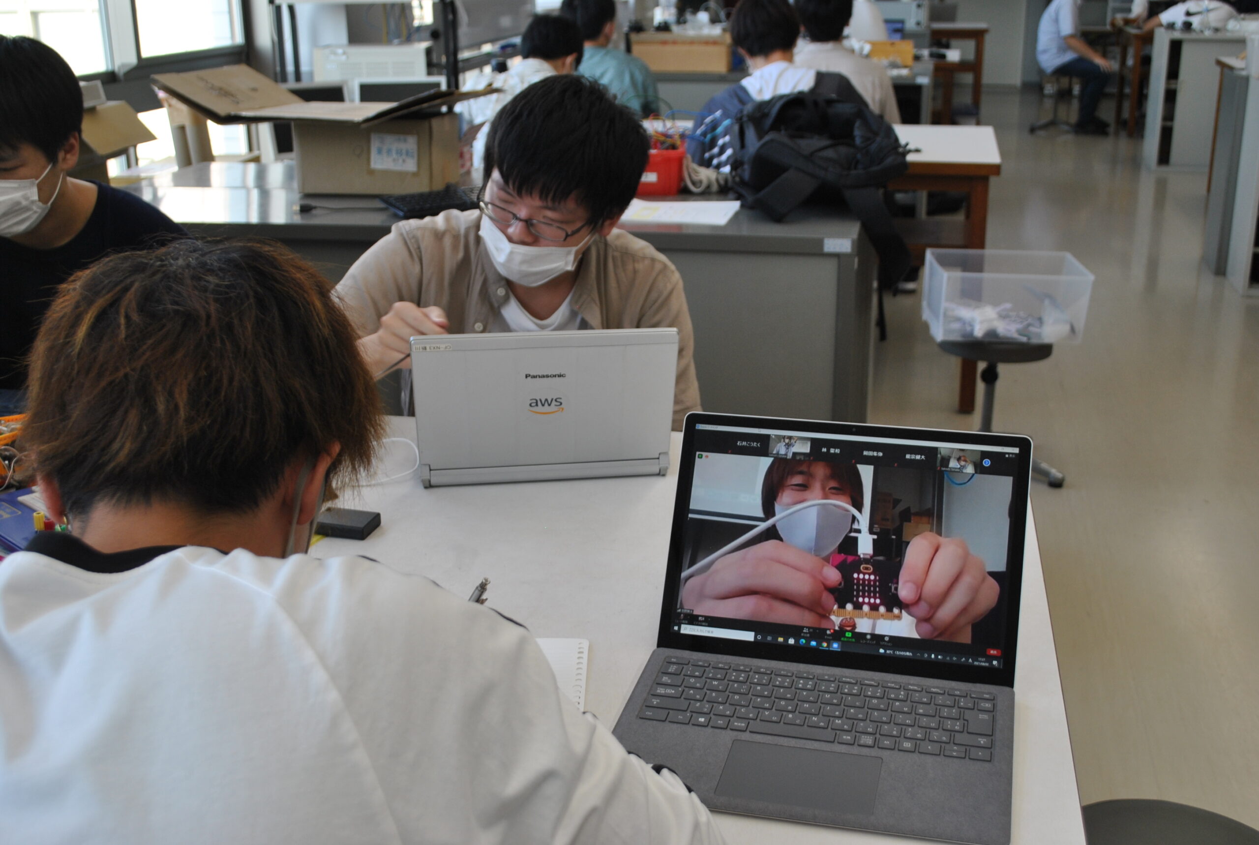 6月以降、対面での実習授業になり、チームに分かれてマイコンを使って面白いデバイスを作ろう!という自由研究のような形態となりました。4~5人くらいで7つのチームに分かれ、「micro:bitでシューティングゲームやオセロゲームを作ろう」「非接触体温計を作ろう」「ドローンを作ろう」「無線操縦ロボットを作ろう」「micro:bit のパチモンのパチクロビットを作ろう」等々の興味深いプロジェクトが立ち上がり、授業が進行しました。
