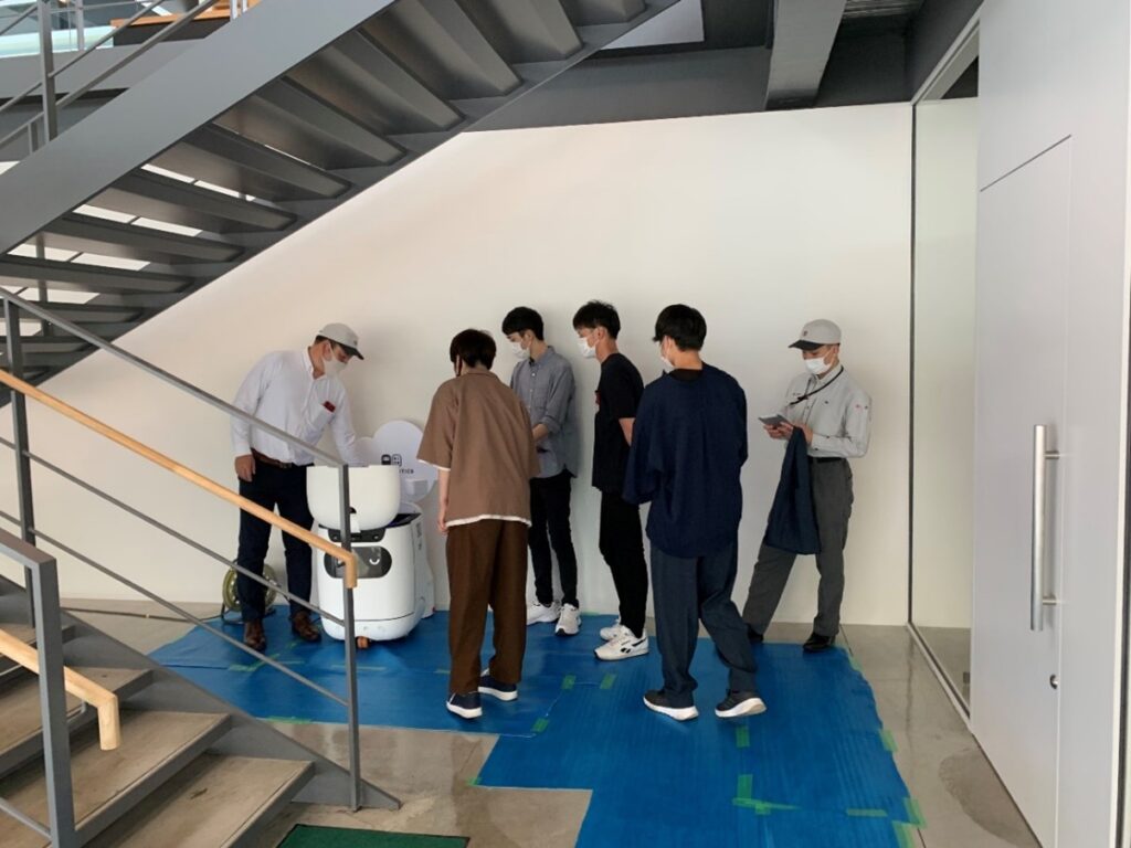 これに対し、建設業界ではICT、ロボットなどの先端技術の活用で労働者不足や高齢化に対応しようとしています。今回、竹中工務店の協力の下、先端技術活用モデルプロジェクトについて先端技術の活用状況等を現地調査するとともに、学生計6名と教員で施工担当者及び開発担当者から課題や今後の展望について説明を受け、その後、学生からのプレゼンテーション、そして最後にディスカッションを行いました。