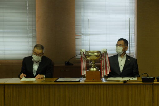 そして、枝廣市長より激励の言葉をいただき、千代川主将へ激励金が贈呈されました。