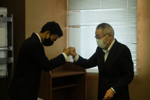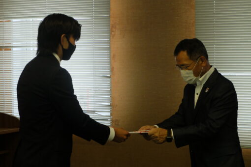 そして、枝廣市長より激励の言葉をいただき、千代川主将へ激励金が贈呈されました。