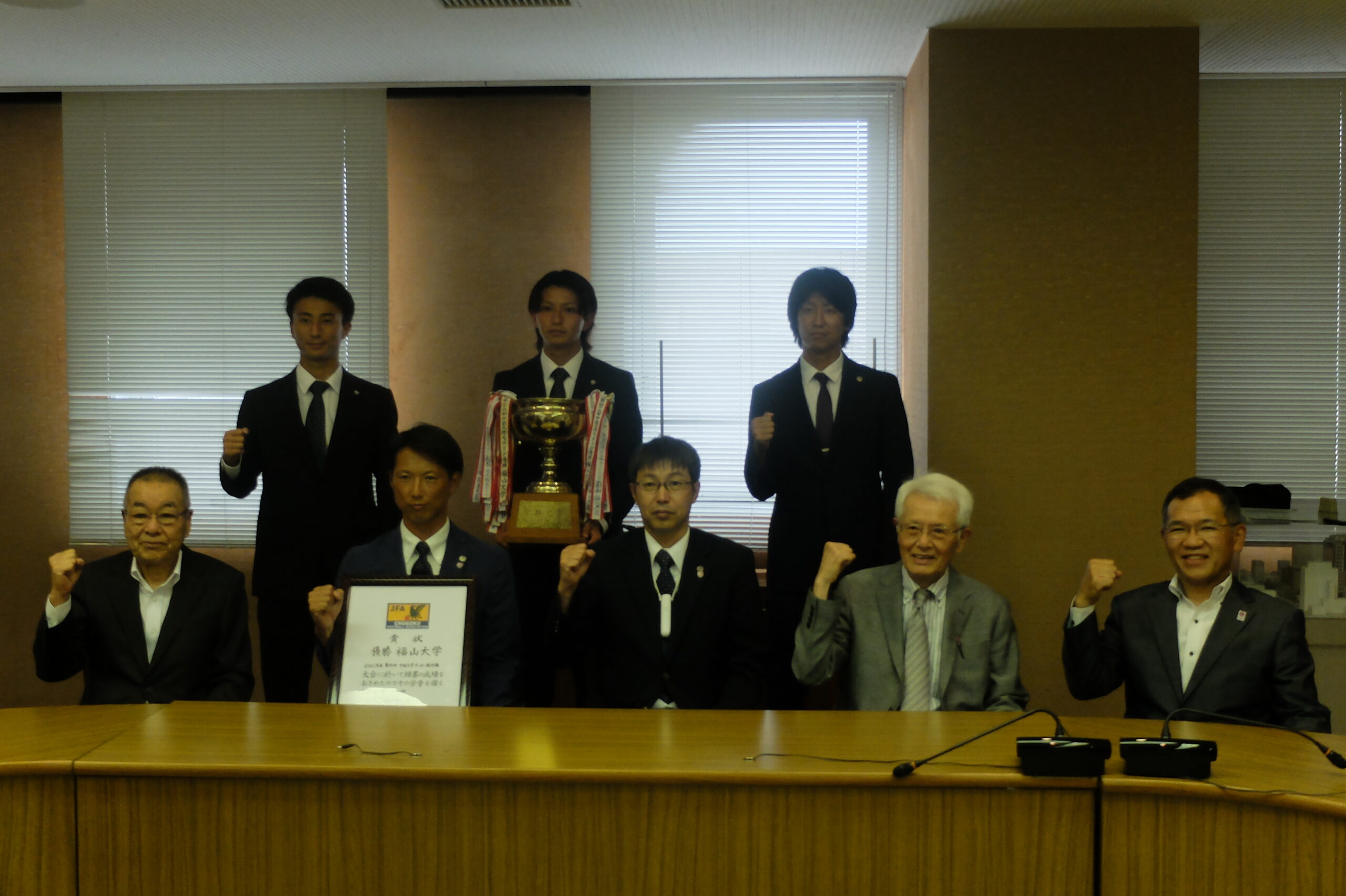8月11日(水)、斜森サッカー部長、的場監督、木村コーチ、千代川主将、保枝副主将代理が福山市役所を訪問し、枝廣直幹市長及び小川眞和市議会議長に出場の報告を行いました。また、永年福山市役所へ勤務され、枝廣市長とも親しい平田経済学部長補佐にも同行していただきました。(企画・文書課投稿)