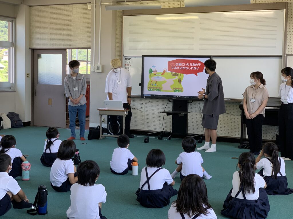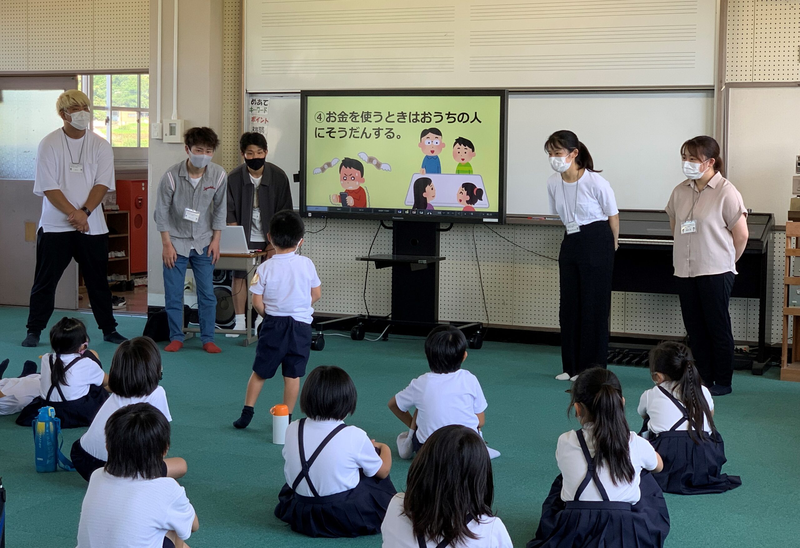 さて、迎えた当日、緊張した面持ちのメンバーもいましたが、始まってしまえばやるしかない!参加したメンバーは全10名。5名ずつ低学年班と高学年班に分かれて、防犯教室を実施しました。先ほど紹介したキャラクターやイラストを用いた資料で、ゆっくりと丁寧に説明しました。