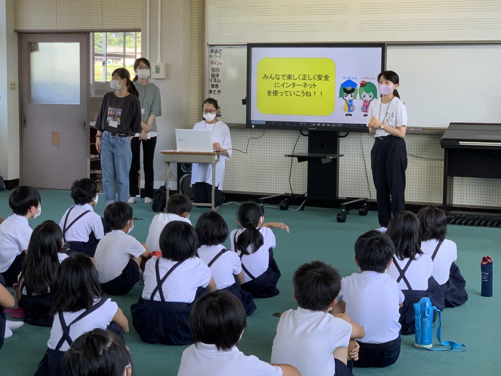 7月28日(水)、福山市立熊野小学校の1年生から6年生の児童を対象として「インターネットの使い方」と題したサイバー犯罪防止教室を行いました。7月中旬に広島県警サイバー犯罪対策課から小学校での防犯教室のお話をいただき、4年生の岡田諒子さんと加賀山海咲さんを中心に急ピッチで準備を進めました。