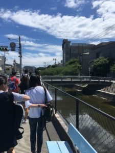 今回の「日本語・日本文化研修」は、淡江大学のみなさんの宿泊先となっている尾道の散策から始まりました。本来であれば、人間文化学部の学生たちも一緒になって散策することとなっていたのですが、豪雨災害に伴う補講が入ってしまいましたので、淡江大学のみなさんと学部教員、そして地域のみなさんとの交流会となりました。