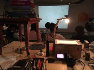 こちらが、展示室内にセットされたコンサート会場の様子です。こちらでライブで描いたものがプロジェクションされる仕組み。いろんな素材を使って絵を「描か」れるので、幻想的な雰囲気が広がっていました。