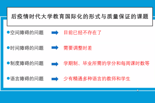 インターネットを介した遠隔授業により、空間の壁は完全に取り払われました。次に、もし同期型双方向の遠隔授業を国境を越えた広がりの中で考える時には、時間(時差)の壁を考えなくてはなりません。さらに、本格的な双方向的な教育を考える場合には、学期制、学年の始期、卒業に必要な単位数、週当たりの授業時間数などの制度の壁、そして最後に言葉の壁をも考えなくてはなりません。
