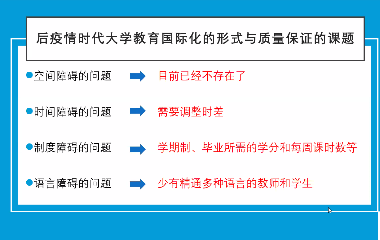 コロナ禍の後、空間、時間の他、制度と言葉の壁が取り除かれ、まったく障壁のない状態で大学教育の国際的な運用が可能かどうか、そして教育の質を如何にして保証するか、われわれは尚いっそうの研究を必要としているのです。」