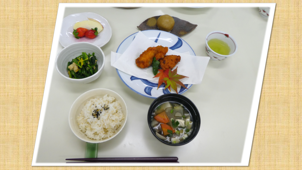 また、一昨年実施した時の様子をここで紹介します。令和元年は「おいしい!簡単塩分カット術」と題して、減塩するときのポイントを解説した後、調理しておいしい減塩食を食べることができました。献立は、玄米入りご飯、鮭のもみじ揚げしし唐添え、ほうれん草と貝柱の柚子胡椒和え、具だくさんのっぺい汁、利休まんじゅう、果物(苺と林檎)と6品でした。