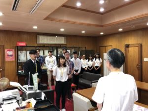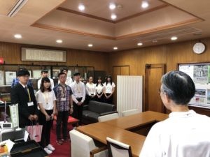 1限目は、平学部長による歓迎の挨拶とオリエンテーションでした。研修プログラムとともに、福山大学グッズがプレゼントされました。そして、9時半には学長室を訪問し、松田学長から「期間中は熱中症などの健康に留意して、日本語・日本文化に関することを学ぶとともに、本学学生との 交流を深め、良い想い出を作ってください」と激励を受けました。