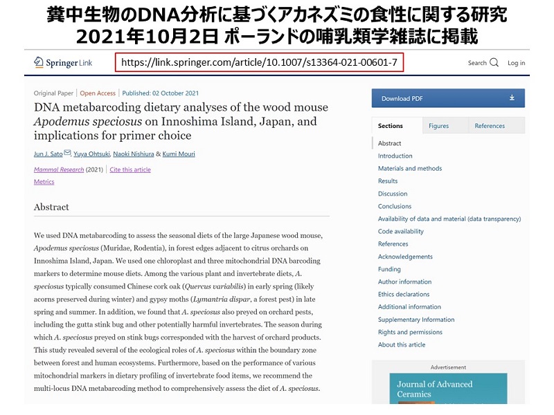 論文の内容は、因島の森に生息するアカネズミのウンチの中身をDNAで分析して、アカネズミが何を食べているのかを明らかにしたものです。尚、詳しい内容はYoutubeで解説しております。是非、ご覧になってください。プレスリリースはこちらからどうぞ。この論文はオープンアクセス論文ですので、どなたでも無料でダウンロードできます。