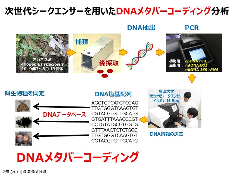 そこで、ウンチの中にある生物のDNAを検出できれば良いという発想にたどり着きました。まず、2019年3月から8月にかけて、因島椋浦町の森で、19個体のアカネズミを採集しました。その後、トラップに付着した糞を回収して、DNAの抽出を行いました。次に、糞の中の植物と無脊椎動物を検出するために、4つのDNA領域のPCR増幅を行い、その後、福山大学未来創造館に設置された次世代シークエンサーを使って、DNA情報を決定しました。DNA情報を得た後に、国際DNAデータベースに検索をかけることで、得られたDNAがどの生き物のDNAなのかを同定しました。この手法のことをDNAメタバーコーディング法と言います。