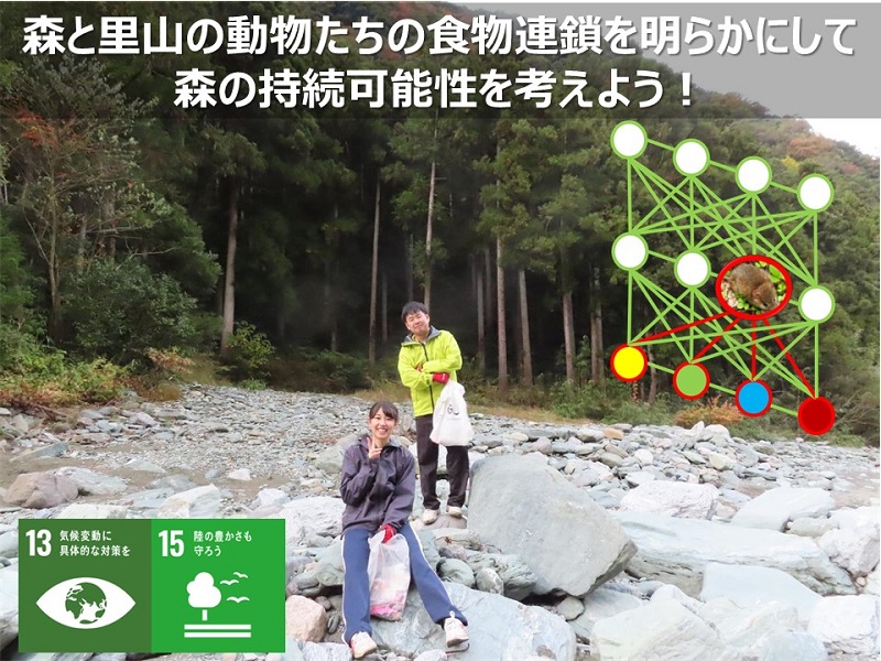 福山大学生物工学科動物学研究室では、森と里山の動物たちの食物連鎖を分析し、森林生態系の仕組みを明らかにすることを通して、森の維持に貢献したいと考えています。日本は、その国土の3分の2が森で、様々な生物が生息しておりますので、森の維持はSDGsの「陸の豊かさも守ろう」に貢献することが出来ます。また、炭素の吸収源である森を維持することは地球温暖化の緩和にもつながります。以上、小さなネズミの小さなウンチの、さらにまた小さなDNAを分析することで、次第に生態系が解き明かされてきたという一つの研究成果を紹介しました。自然や動物に関心のある皆さん、一緒に研究しませんか?