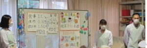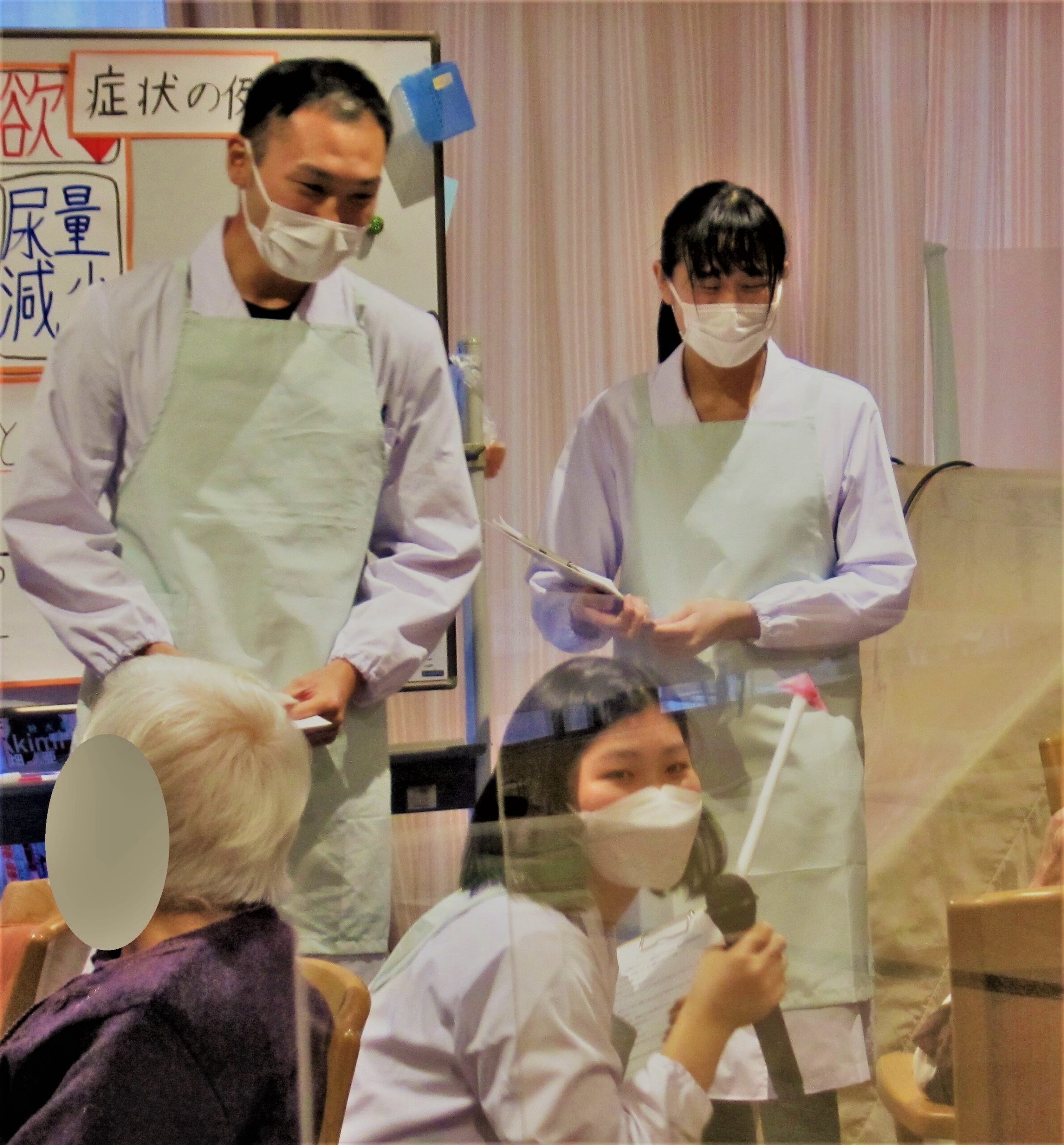 感染予防に細心の注意を払いながら、学内でしっかり練習した発表手順に従い、利用者と会話も交わしながら上手く話を進めていました。高齢者に分かり易いか何度も学生間で話し合い、楽しい雰囲気作りにも気を配りました。また、教材として、おやつ食材の解説や健康をテーマとしたリーフレットも作成して参加者に配布しました(特別養護老人ホーム新山荘にて)。