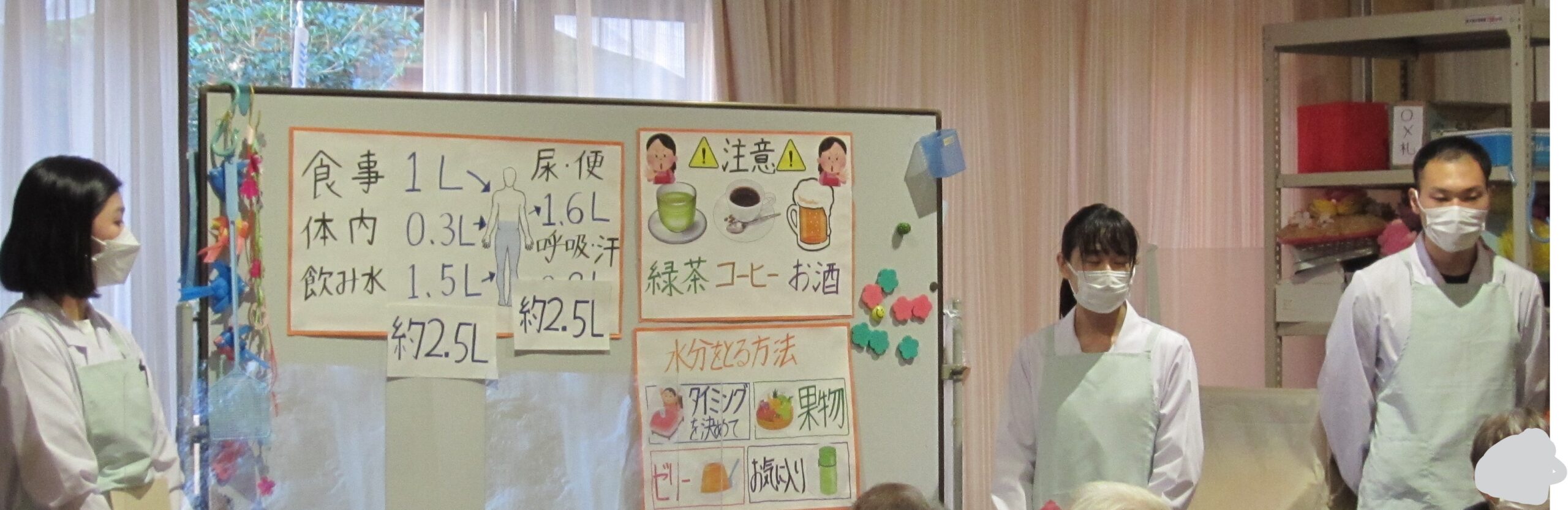 下の写真は、今年度、高齢者福祉施設での栄養教育を行っている様子です。テーマは「水分摂取の大切さ」で、寒くなる季節でも必要量を摂ることは健康維持に重要であることをお知らせしています。