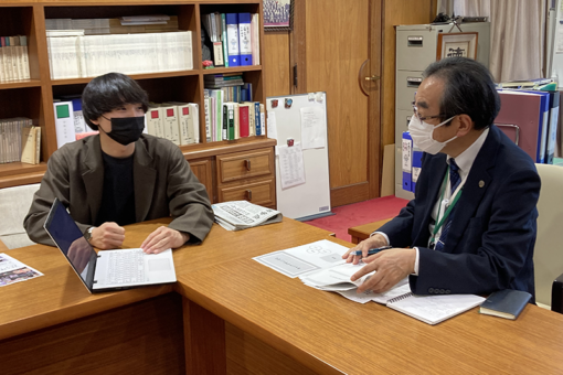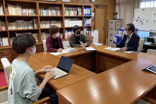 こんにちは、人間文化学部メディア・映像学科2年生の森山竜斗です。前回の学長室訪問(2021.5.19)から約5ヶ月が過ぎました。夏休みを挟んで、これまでに活動してきたことや進捗状況について改めて学長に紹介したいと思い、キャリアデザインゼミのリーダー藤本くん(心理学科2年生)、野上くん(心理学科2年生)と一緒に学長室を訪れました。