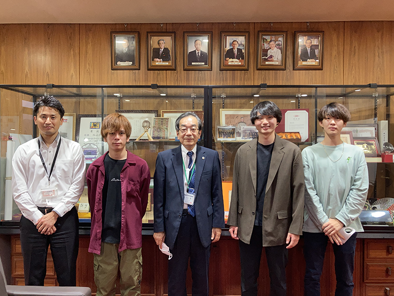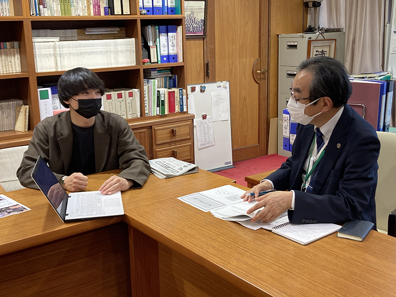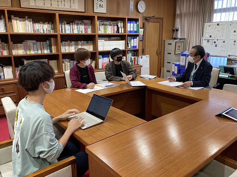 こんにちは、人間文化学部メディア・映像学科2年生の森山竜斗です。前回の学長室訪問(2021.5.19)から約5ヶ月が過ぎました。夏休みを挟んで、これまでに活動してきたことや進捗状況について改めて学長に紹介したいと思い、キャリアデザインゼミのリーダー藤本くん(心理学科2年生)、野上くん(心理学科2年生)と一緒に学長室を訪れました。
