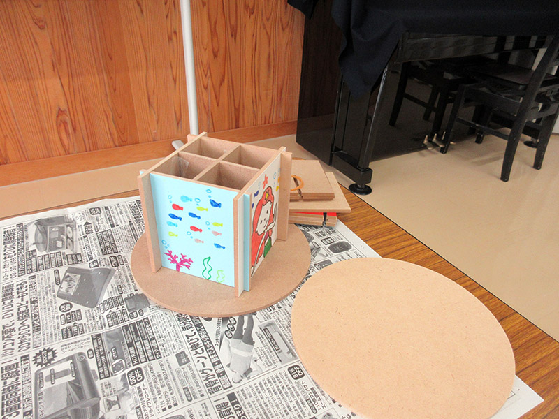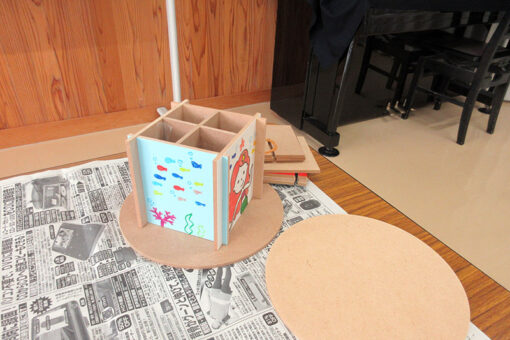 今年の2月ごろ、地元の企業「東和工業」のY部長からMに呼びかけがありました。「地元の企業として、何らかのかたちで地域に貢献できることはないだろうか?」・・・そこでMの学生たちがいろいろなアイデアを提案し、最終的にペン立てを親子で作る工作教室をやってみよう!ということになりました。東和工業は、木材の繊維を固めて作ったボードに種々のフィルムをラッピングする木材加工の会社です。そこで、製品の製造過程で出る端材でパーツを作ってそれを組み合わせて「何か」を作る工作をやろうということになったのですが・・・何を作るか、大きさはどのくらいにするか、ラップフィルムの色はどうするか、作品に絵を書くか、デコレーションをどうするかなど・・・Mの学生と会社の担当者とが何度か打ち合わせを行い、形は同じでも子供が自由に装飾するオンリーワンのペン立てにしようということになりました。