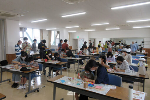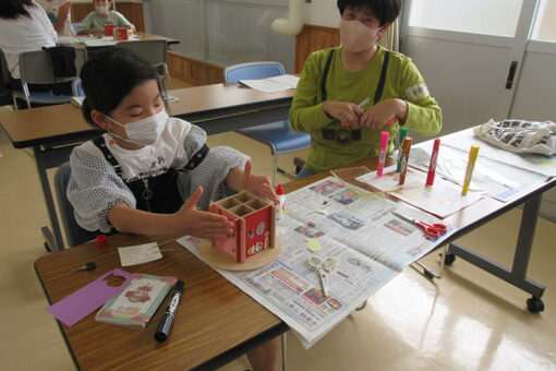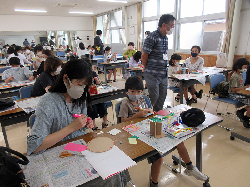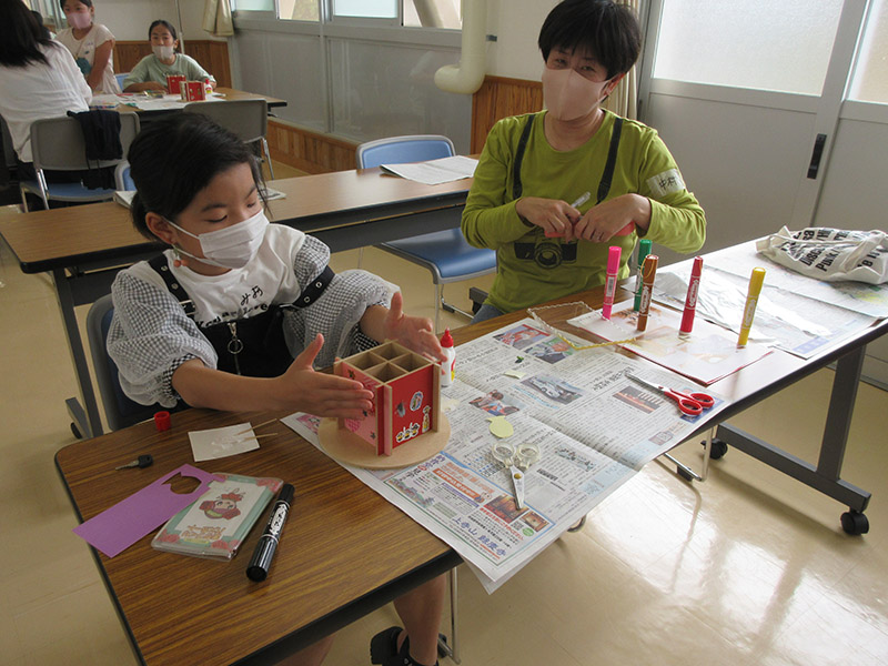 東和工業のOさんから組み立て方の説明を受けた後、子ども達は自由な発想で絵を描いたり、デコレーションを考えたり・・・まさに「天才」を発揮して、オンリーワンの作品を作っていきます。親子の笑顔と楽しそうな語らいに、スタッフ一同、心が和みました。子供たちは「楽しかった」「おもしろかった」「今度はもっと上手に作るぞ」などといいながら、作品を大切に持って帰っていました。