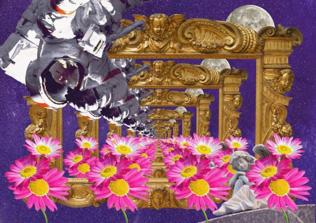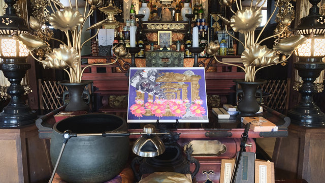 また、私はゼミでコラージュアニメーションを用いたMV(ミュージック・ビデオ)の制作をしているのですが、それは著作権の関係で持ってくることができなかったため、雰囲気だけでも伝えようと平面のコラージュ作品を展示しました。私の作品はお寺の本堂の中央に置かせてもらったのですが、コラージュの宗教的な不思議な世界観とお寺の装飾がマッチしてすごく馴染んでいました。