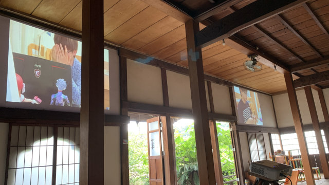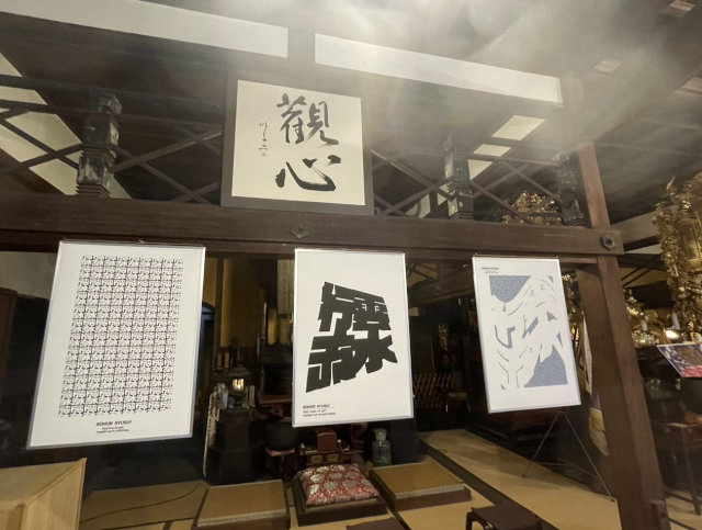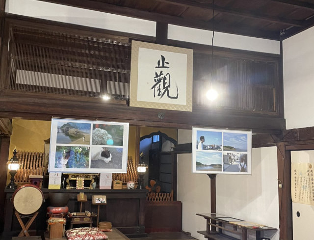 普段、映像は画面かスクリーンに映った状態でしか見ることはありませんが、今回はお寺の壁に投影ということで、壁の質感が感じられたり外の音も聞こえたりと、新鮮な環境での展示となりました。また、お寺の本堂に入ると壁に掛けられたデザインや写真がまず目に入り、お寺の荘厳なイメージにアートが加わり、ポップさのある空間になりました。柱にも写真が散りばめるように貼られており、気付くとワクワクする展示方法になっていました。