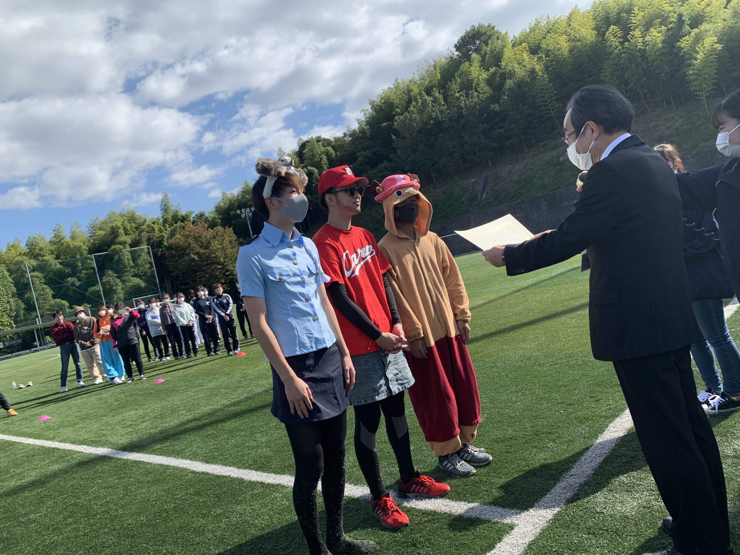 学長から一言:昨年来、にっくきウイルスのために開催できなかった学長杯をかけた球技大会が、やっと開催できました。天も味方して、爽やかな秋晴れ、絶好のコンディションでの大会になりました。今回はドッジボールとは、少々「幼すぎるか」などと思っていましたが、おっとどっこい、相当な運動量のようでした。長い自粛生活で若いエネルギーを発散する場がなかった皆さんが、奇抜な着ぐるみや仮装選手も含めて、弾けるように試合に興じる姿に、こちらまで楽しい気持ちになりました。やはり若者には青空と大声と笑顔がよく似合う。企画・運営に当たった学友会執行部の皆さん、ありがとう!